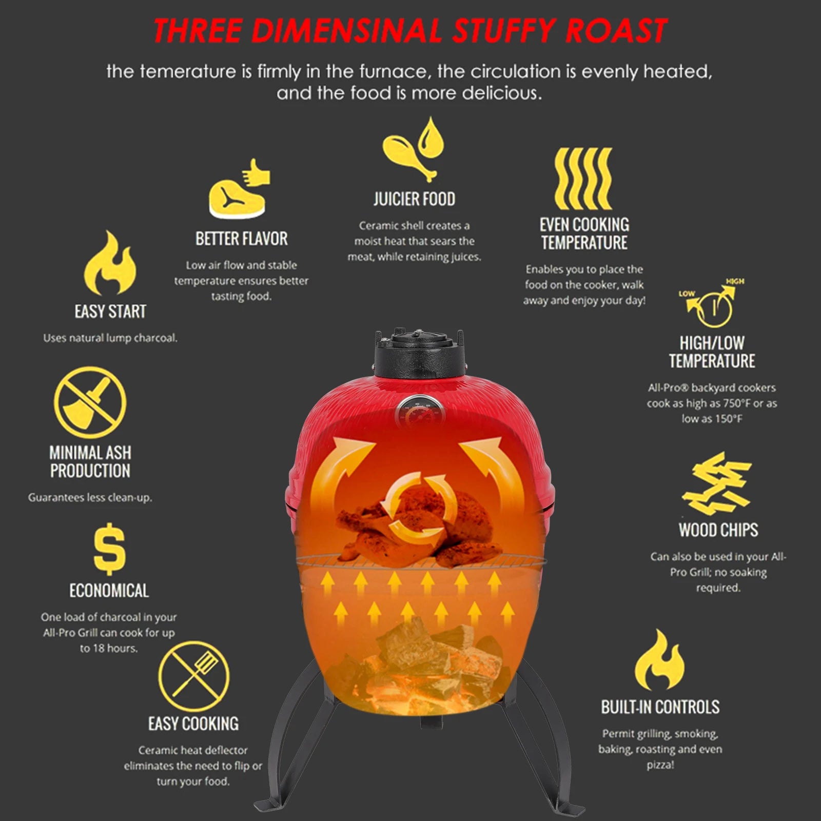 3. Multiple Cooking Styles The versatile charcoal-fueled grill is able to perform in multiple different ways. The heat retention and outstanding control of air flow makes baking fresh bread or even gourmet-style pizza possible. Explore your culinary creativity and grill, smoke, bake or roast.